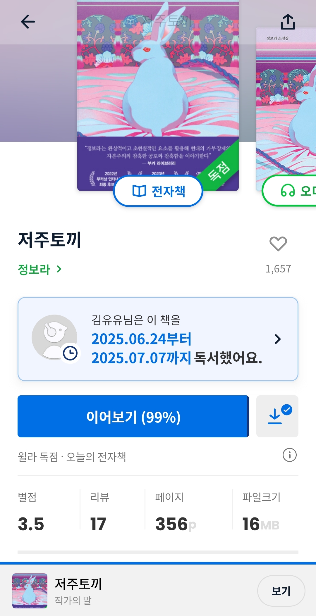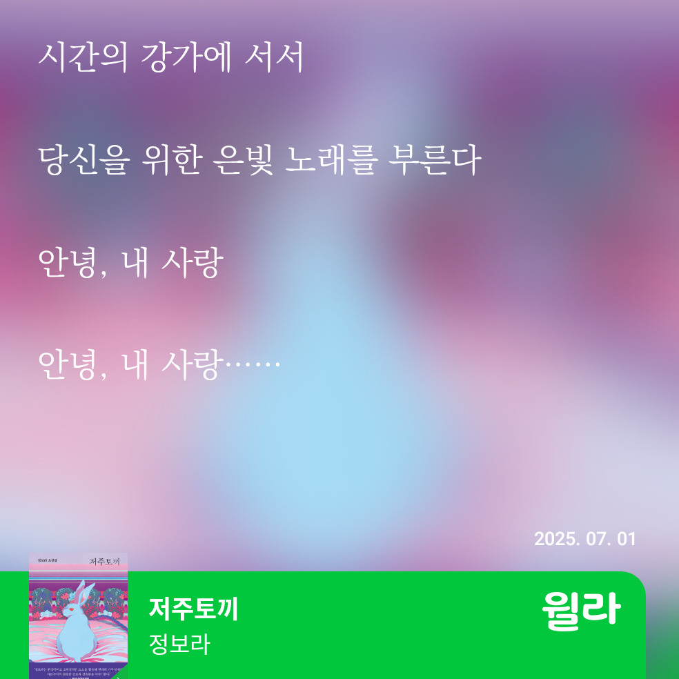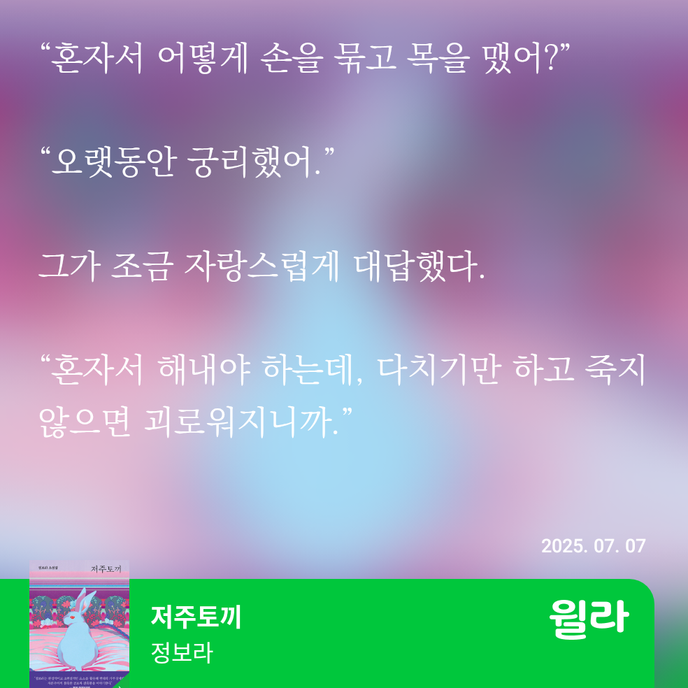 다 쓰고 나서보니, 두 책에 대한 감상이 갈린 이유가 장르에 대한 호불호 때문이 아닌가, 싶기도 하다. 워낙에 sf장르를 좋아하는지라...ㅋㅋ <저주토끼>에서 마음에 들었던 세 단편 중 하나인 '안녕 내 사랑'도 sf로 분류되는 소설이었고...ㅋㅋ
