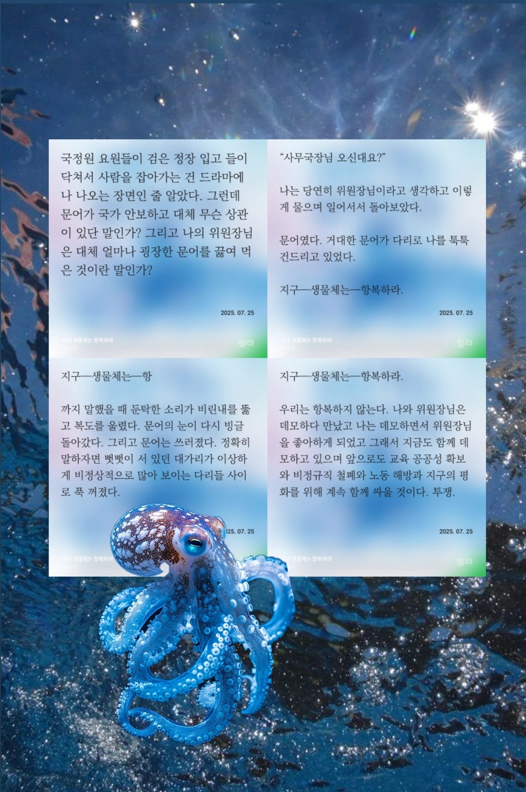 유쾌하다. 사회의 이면을 거침없고 명쾌하게 찔러내는 필력이 돋보인다. 한 가지 아쉬웠던 점은, 내가 사랑하는 생물 중 하나인 '문어' - 이 영리한 두족류의 매력이 맛깔나는 해물탕 재료 그 이상으로 느껴지지 않았다는 점.