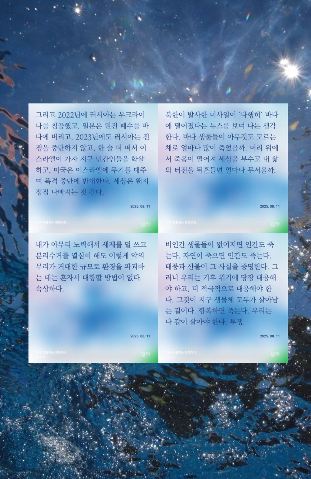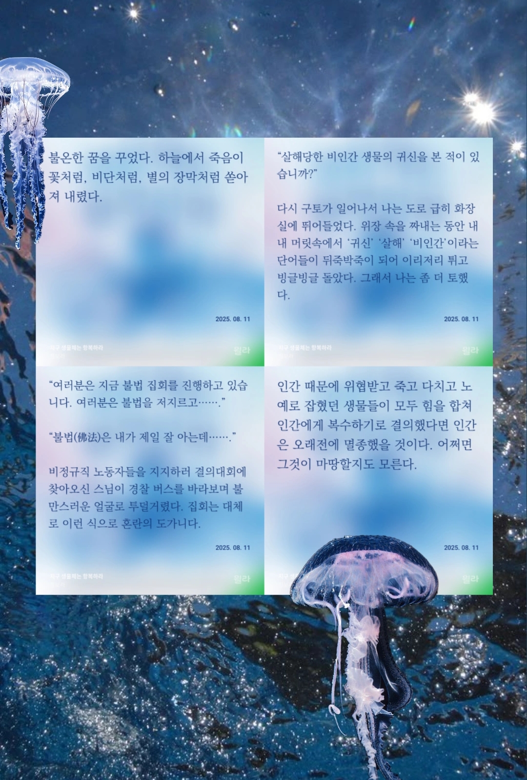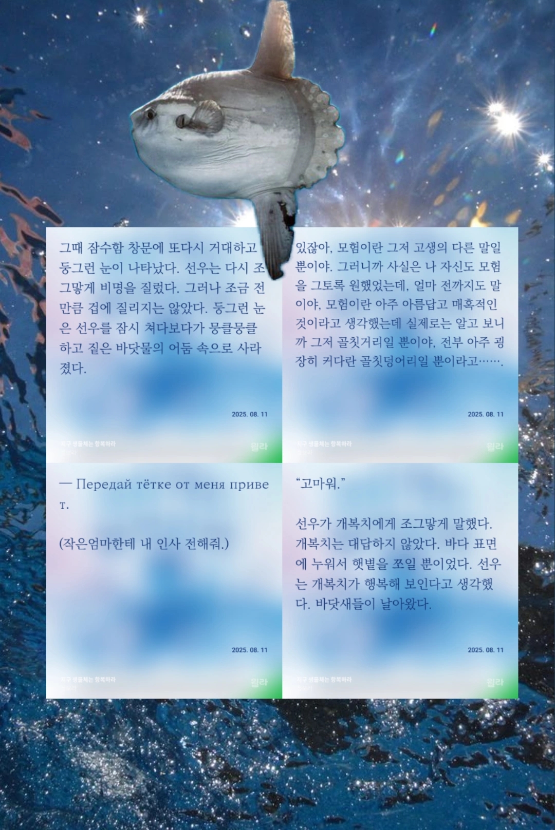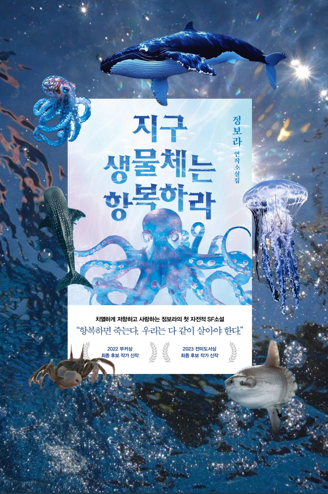 검은정장의 정체는 이 소설이 사실 작가님의 자전적 소설이었다는 사실만큼 놀랍고, 반가웠다. 내가 세제를 적게 쓰고, 열심히 재활용하고, 일회용품 사용을 줄여도 일본이 오염수를 바다에 붓고, 기업들은 산을 깎아 골프장을 만들고, 이익을 위해 다른 나라에 미사일을 날리는 국가 권력자들이 가득한 세상에서 바다를 과연 지킬 수 있을지, 무력감과 회의감이 드는 21세기 지구. <지구 생명체는 항복하라>를 통해 공감과 위로를 받는다. 누가 뭐래도 난 동물이 좋은만큼 동물원은 싫고, 사회생활 하려면 필수라 그래도 골프장이 역겹고, 울적할 때마다 이런 SF 소설 읽고, 돈 생기면 멸종위기종 보호에 기부나 하면서 그렇게 살고싶다.