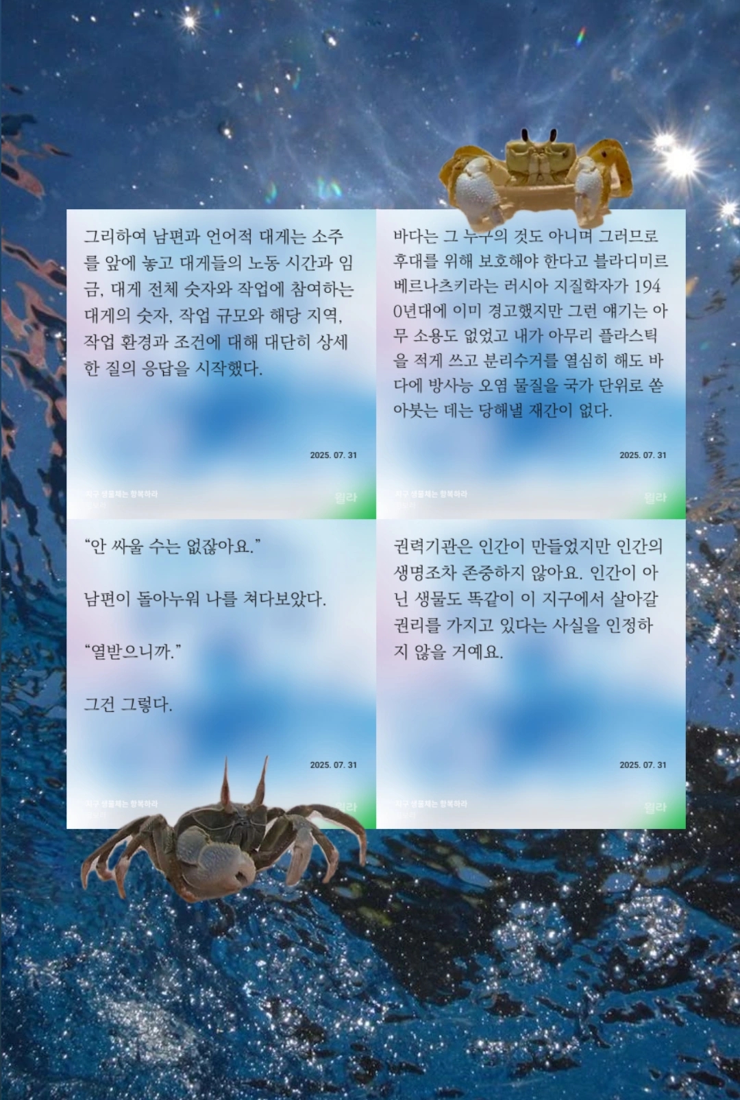 냄새 나고 끈끈한 체액으로 뒤덮인 물고기의 본질을 파악하는 어린 아이의 순수한 두 눈에서, 수조에 갇힌 생명체들을 보고 서럽게 울던 그녀의 모습이 보였다. 그리고 다시 만나서 너무나 반가운, 9족 러시아 혁명 대게, 예브게니.