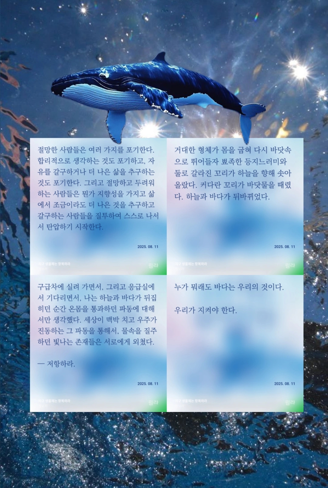 고래를 아낌없이 주는 동물이라고 표현한 것을 본 기억이 있다. 고래가 포식자들로부터 소동물을 보호하고, 인간의 미식과 향을 위해 사냥 당하고, 죽어서까지 바다 환경에 이바지하기 때문이다. 고래가 아낌없이 주는 동안, 인간은 바다에, 자연에, 더 나아가 지구에 무엇을 하였을까? 기술 발전으로 인해 인류는 과연 진보한 것일까? 아니면 인간 소외에 대한 고려 없이 자연을 마구 파괴해가며 인간종을 자연의 싸이클에서 소외시키고, 서식지를 스스로 훼손하며 퇴보한 것일까? 자연과 환경에 대한 보호 없이 이루어지는 개발을 발전이라고 부를 수 있을까?