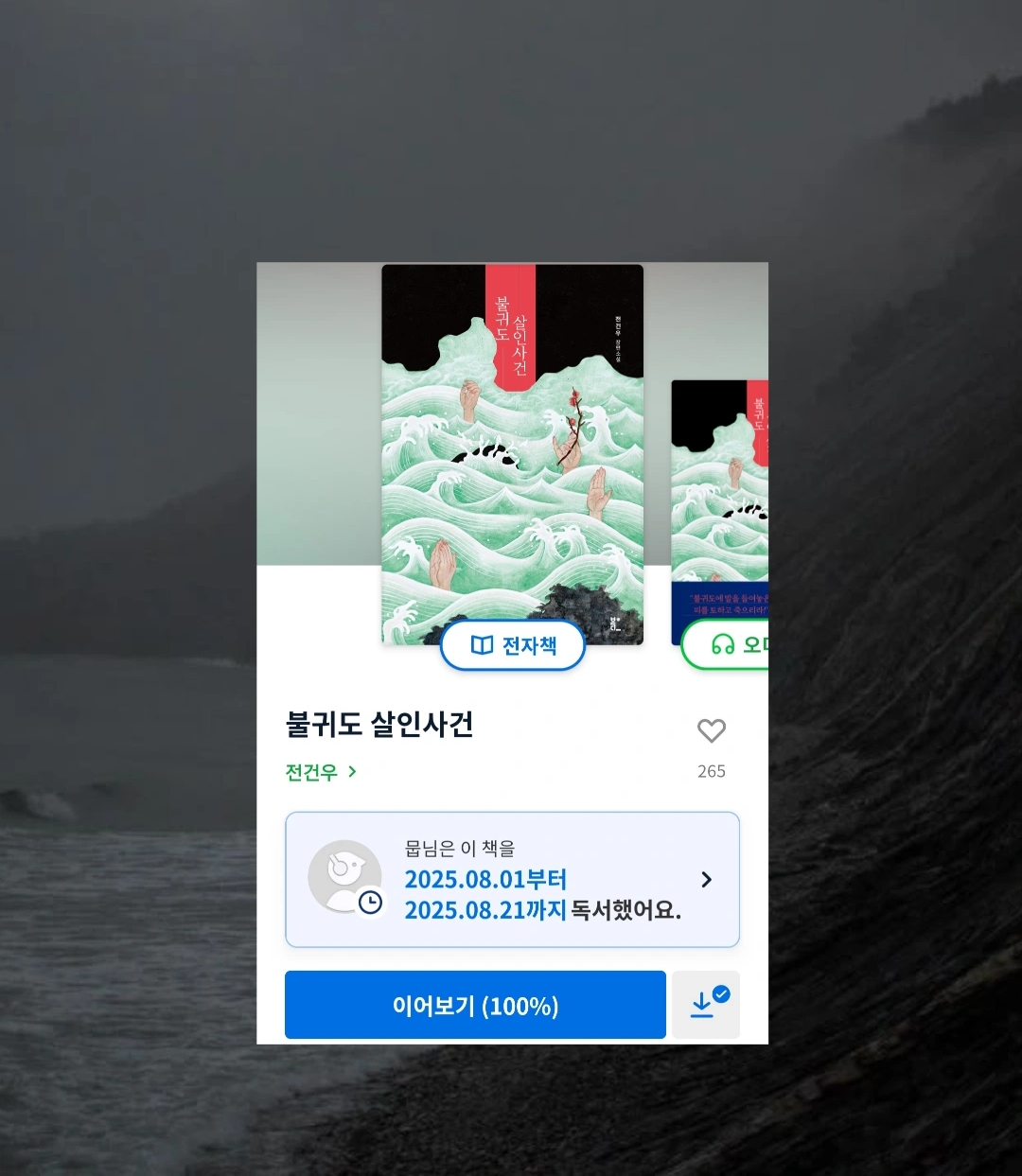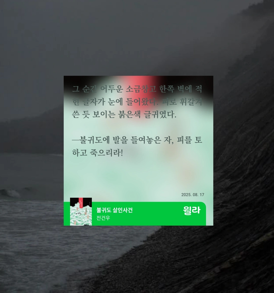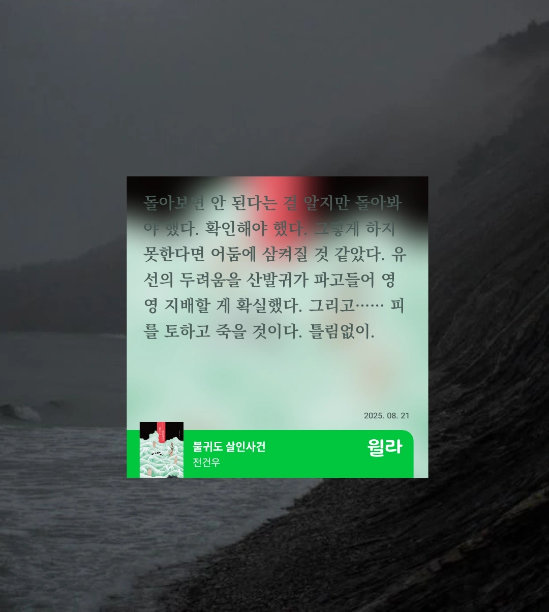 흡입력 있고, 스피드 있는 전개 덕에 짧은 시간 안에 후루룩 읽었지만, 사실 폐쇄된 섬에서 일어나는 연쇄 살인 사건이라는 소재 자체가 아주 참신하지는 않았다. 비슷한 설정과 소재의 웹툰, 영화, 소설 등이 이미 많기 때문에 읽는 내내 기시감이 느껴졌달까.