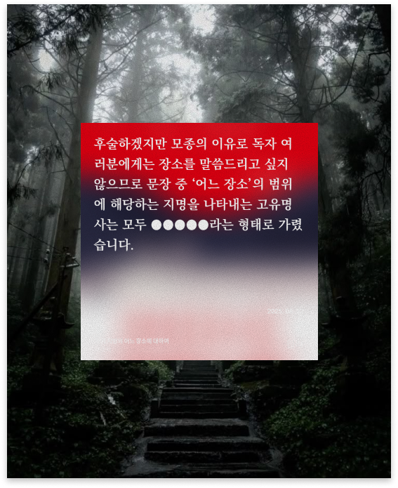 호러 마니아로서 여름이 오면 공포 콘텐츠는 빼놓을 수가 없다. 컨져링 유니버스, 민속촌 귀굴 등을 비롯한 귀신의 집을 다녀오고, 공포 영화도 몇 편 보고. 이제 남은 건 소설뿐이다. 따라서 제목에 지역 이름이 들어가는 한국과 일본의 공포소설을 각각 읽었다.