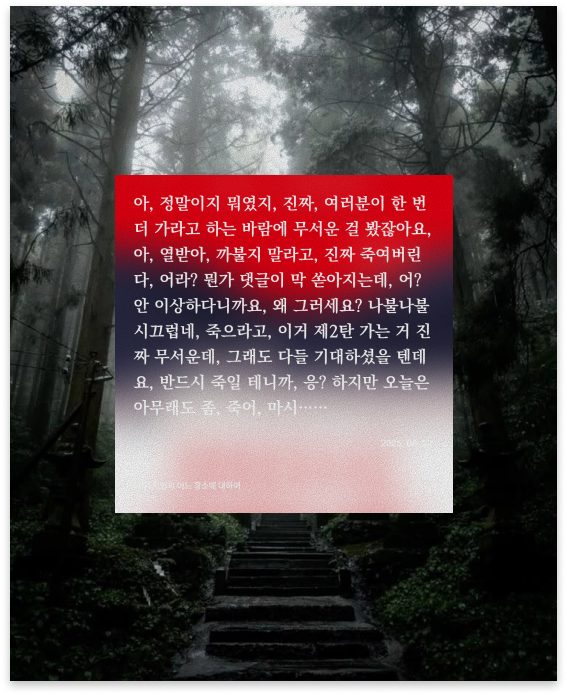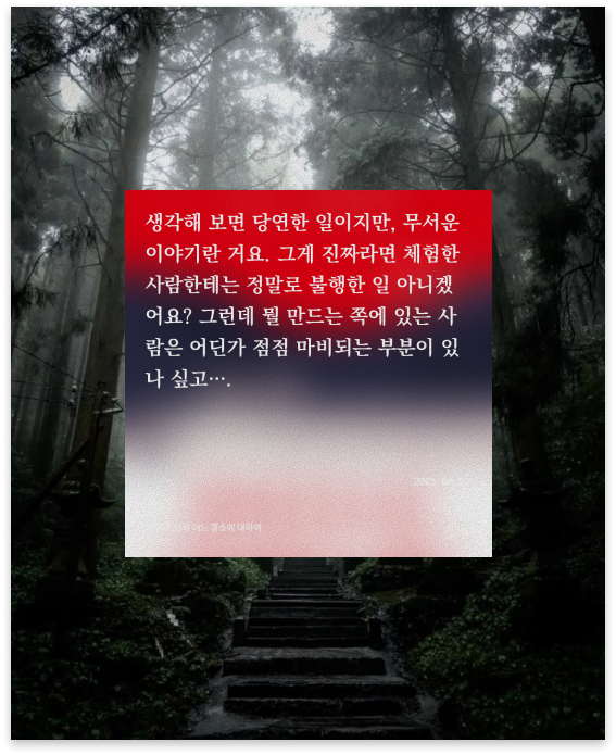 처음에는 어디선가 들어본 듯한 익숙한 괴담을 모아 놓은 소설이라 생각했다. 인터뷰, 인터넷 글, 제보편지, 라이브 실황 등 다양한 매체의 짧은 글들을 모아놓은 터라 금방금방 읽을 수 있었다.
